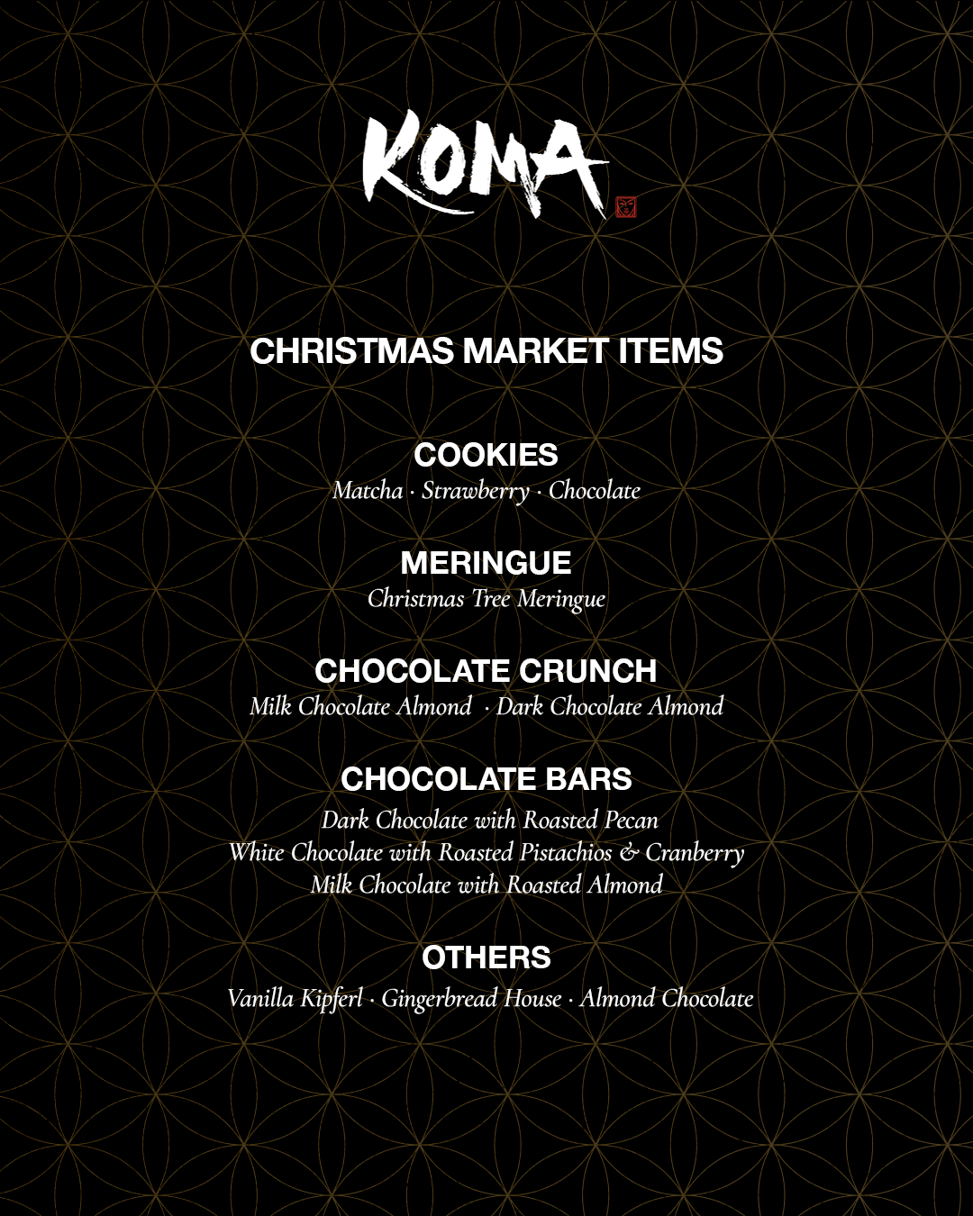 Transport the magic of KOMA home this festive season. Our curated retail collection offers effortless solutions for sophisticated holiday gifting, featuring seasonal luxuries perfect for takeaway. Indulge in our exquisite log cakes and gingerbread cookies, alongside rich chocolate treats and festive sweets. Find the perfect present to delight any table or company.
